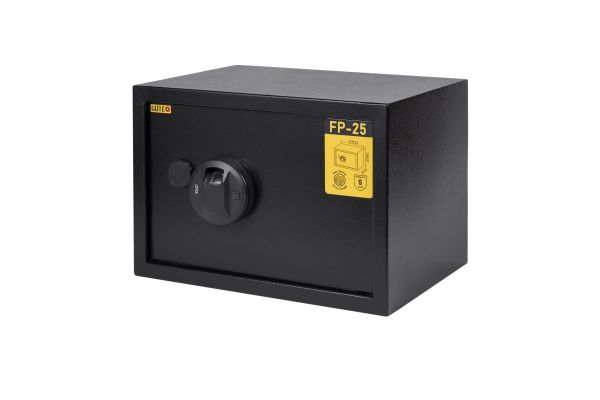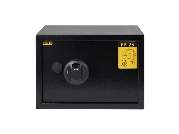 Сейф GUTE FP-25 обладнаний біометричним замком із відбитком пальця, з можливістю встановлення комбінації коду до 20 відбитків. На випадок втрати коду або розрядки батарейок передбачена система аварійного відкриття.