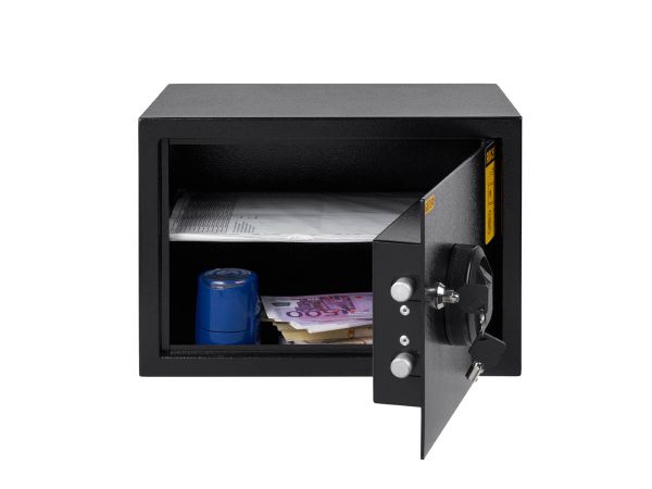 Меблевий сейф GUTE FP-25 з відбитком пальця. Завдяки своїм габаритам, у нього міститься аркуш формату А4. Знімна полиця всередині розділяє місце на два відділення. Товщина металу корпусу 1,5 мм та двері 3 мм. Сейф важить 7 кг, що дозволяє розмістити його в ніші меблів без особливих зусиль. GUTE FP-25 підходить для встановлення як в офісі, так і вдома. Отвори під анкерні кріплення, розташовані на задній стінці та знизу, при кріпленні болтами, дають сейфу додатковий захист.